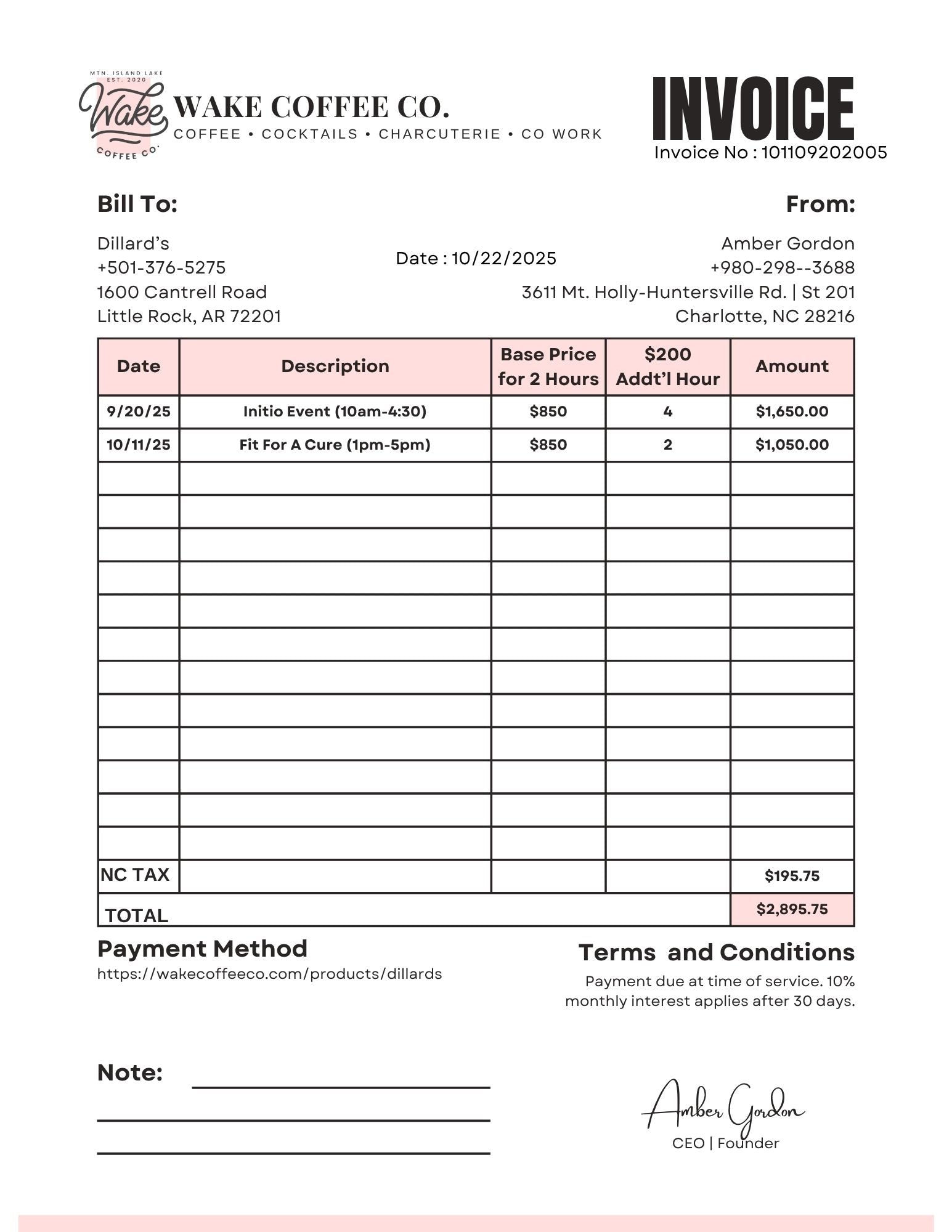 Wake Coffee Co. beverage + bar service for Dillard’s SouthPark events for dates 9/20/25 and 10/11/25.